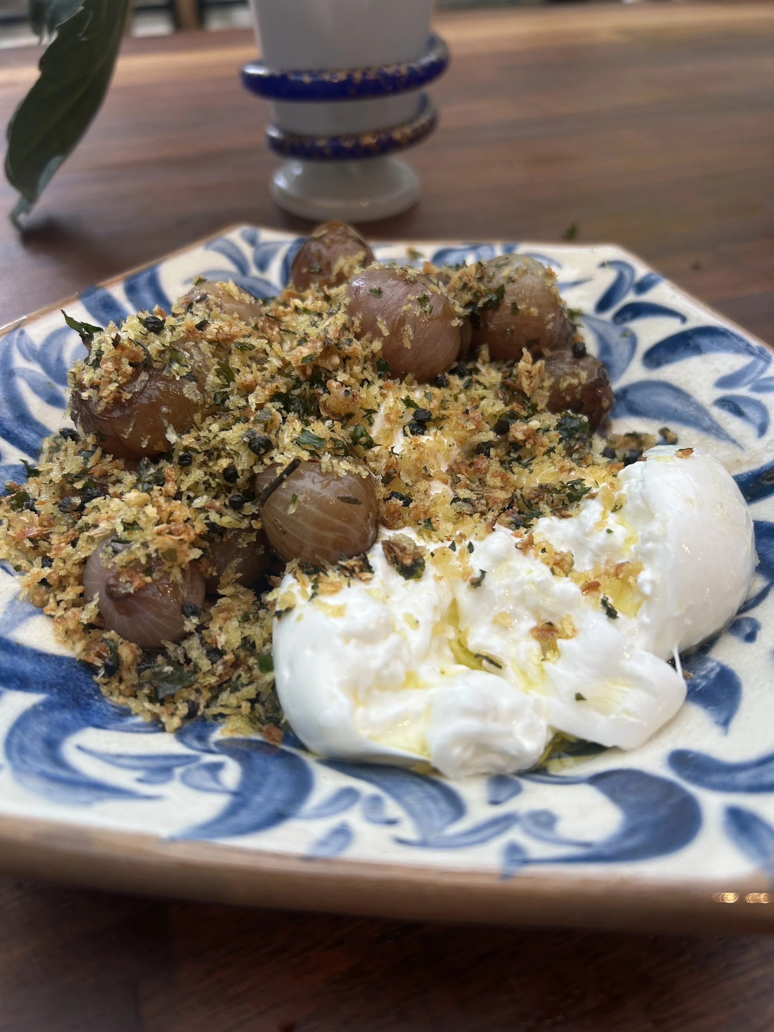Cipolline in Agrodolce (Sweet Balsamic Baby Shallots) with Burrata, Capers, Parsley and Breadcrumbs