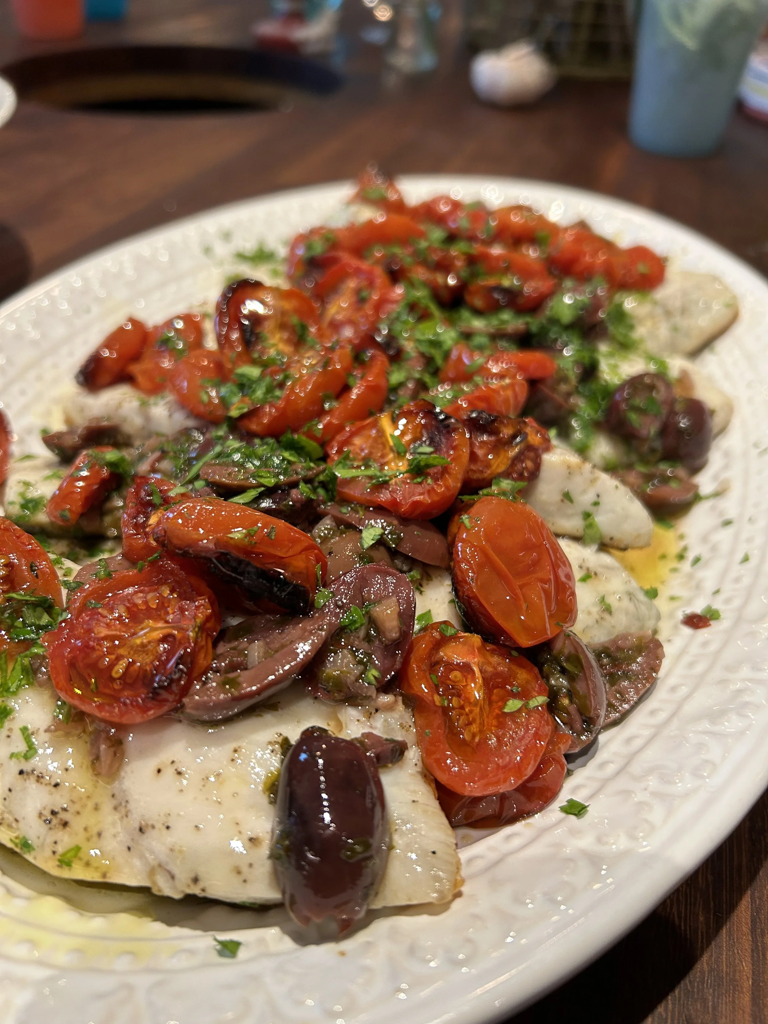 Crispy Sea Bass Fillets with a Roasted Cherry Tomato, Taggiasca Olive and White Wine Sauce